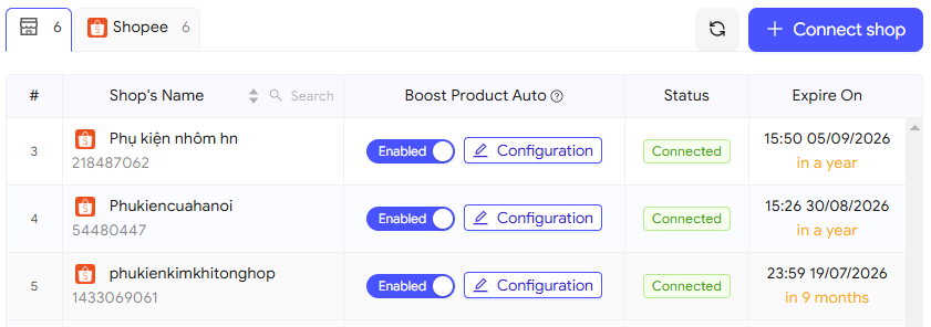 Step 1: Go to https://app.shipxanh.com/dashboard/connect/shops, connect your Shopee shop to ShipXanh, then enable product boosting.